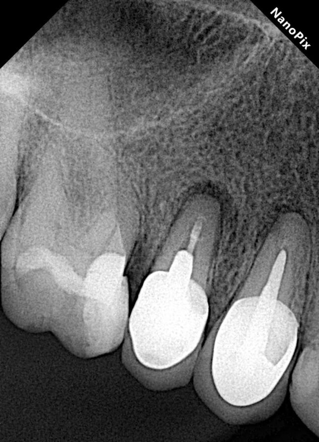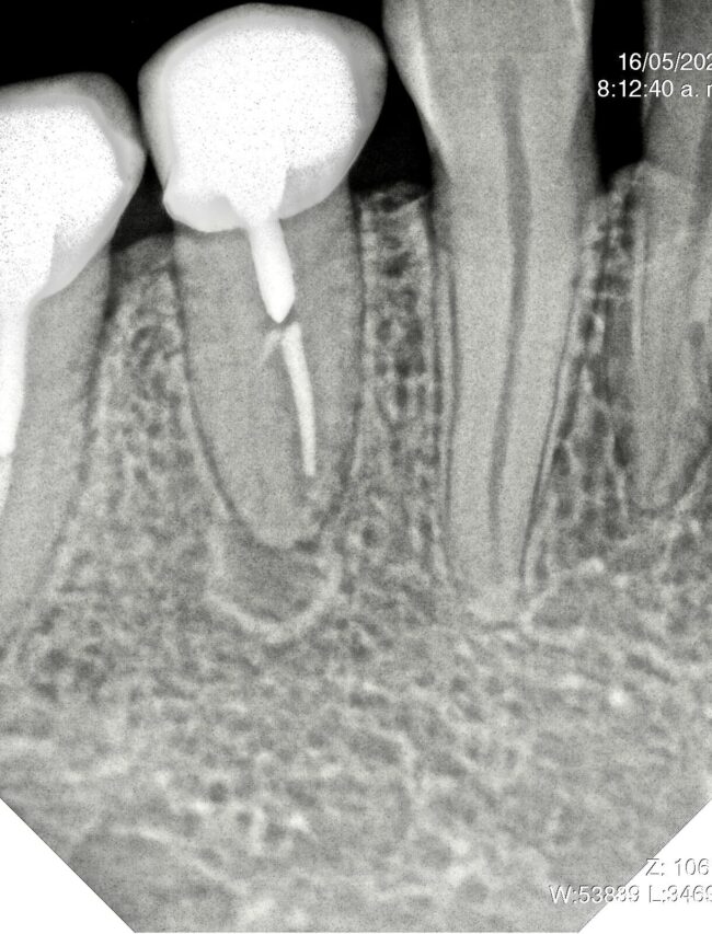 Dr. Marc Llaquet’s clinical case of a reendodontic tooth 2.4 instrumented with RetreatAll® files to remove gutta-percha in which ultrasonic activation was performed with Z-Activator® during irrigation.