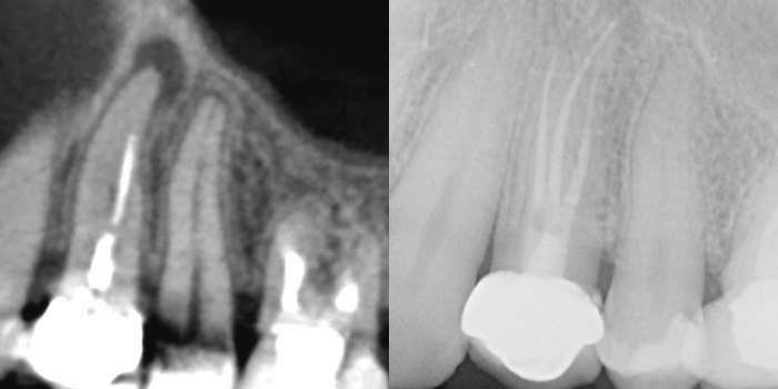 After four years of follow-up, a radiolucent image was observed at the periapical level of tooth 24, although the patient remained asymptomatic. A CBCT (Cone Beam Computed Tomography) was performed to evaluate the size of the lesion, confirming the presence of asymptomatic apical periodontitis and the need for non-surgical retreatment.